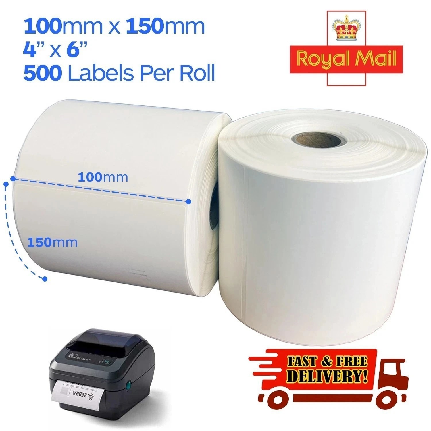 ROYAL MAIL COMPATIBLE 4X6″ 100x150MM DIRECT THERMAL LABELS 500/ROLL ZEBRA TOSHIBA CITIZEN